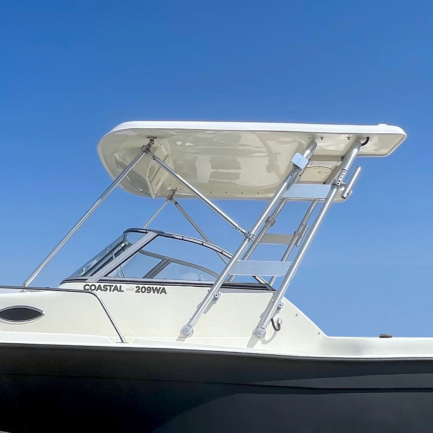 The Arch with Hard Top is a sturdy fishing arch with spaces for mounting fishing rods, and a solid visor for the cockpit of a boat supported by a metal frame. It provides protection from the sun but no protection from wind, rain, or spray when moving forward at any speed. The top provides rain protection only if the boat is stationary and there is no wind.